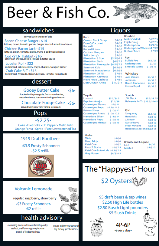 Pair your meal with a selection of refreshing drinks during happy hour, highlighted by $2.00 oysters and well-priced draft beers. Whether you're a seafood aficionado or simply seeking a flavorful meal, Beer & Fish Company guarantees an experience that’s both delicious and memorable.
